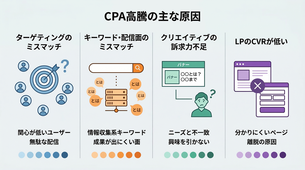 CPAを改善するためには、まずCPAが高騰している原因を正しく理解することが重要です。ここでは、広告運用でよく見られる代表的な原因を解説します。