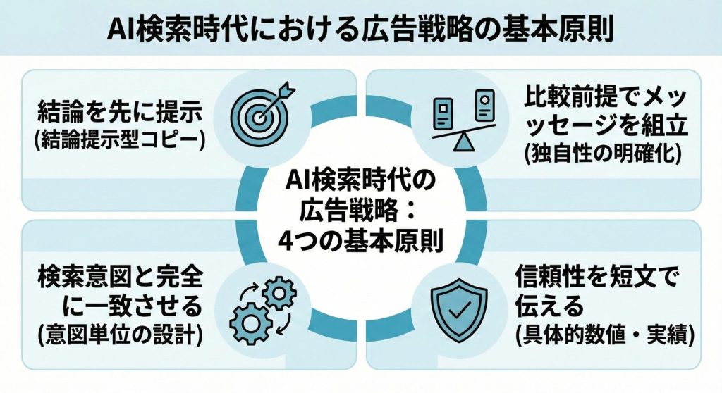 AI検索時代では、説明型の広告は弱くなります。結論を先に示し、成果や差別化ポイントを明確に伝える設計へと修正します。