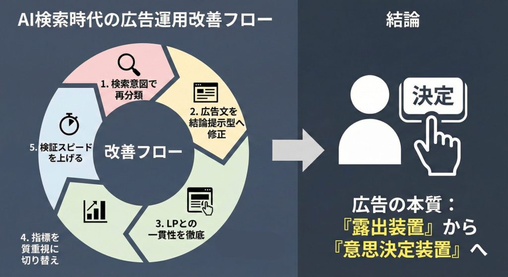 検索意図の深い理解、結論提示型コピー、LPとの整合性、そして高速な改善サイクルを徹底することが重要です。