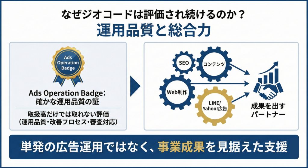 取扱高(Select)と運用品質(Ads Operation Badge)の両方を同時に評価されている点は、ジオコードの大きな強みといえます。
