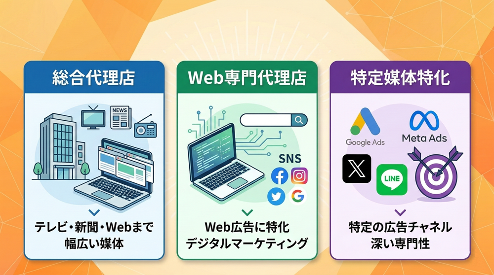Google広告やSNS広告など、特定の媒体に特化した代理店も存在します。