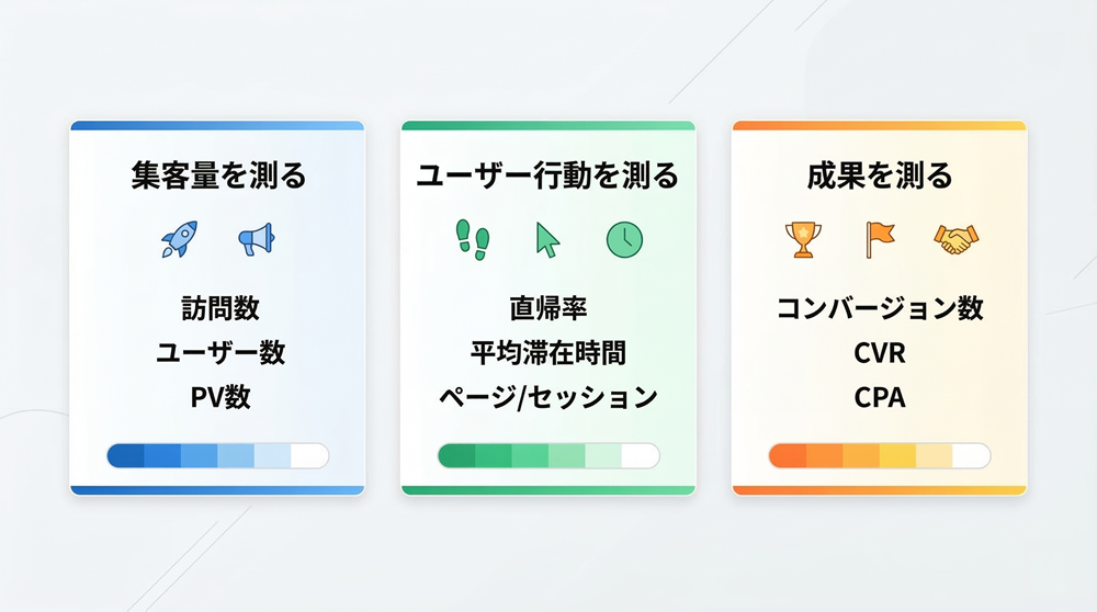 特に、Web集客では集客量、ユーザー行動、コンバージョンといった複数の指標を組み合わせて分析することが重要です。