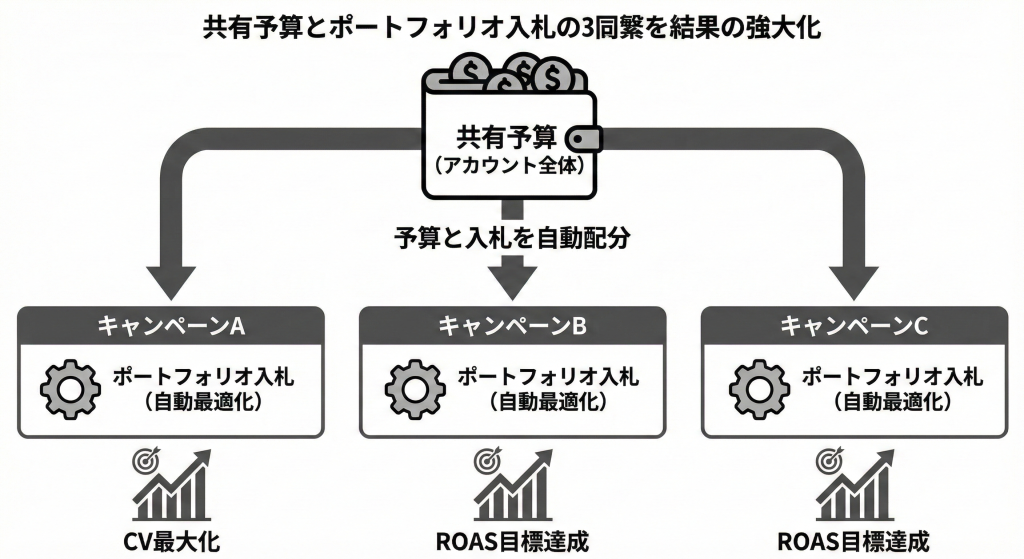 ポートフォリオ入札は、「キャンペーン間の共有予算」機能と組み合わせることで、真価を発揮します。