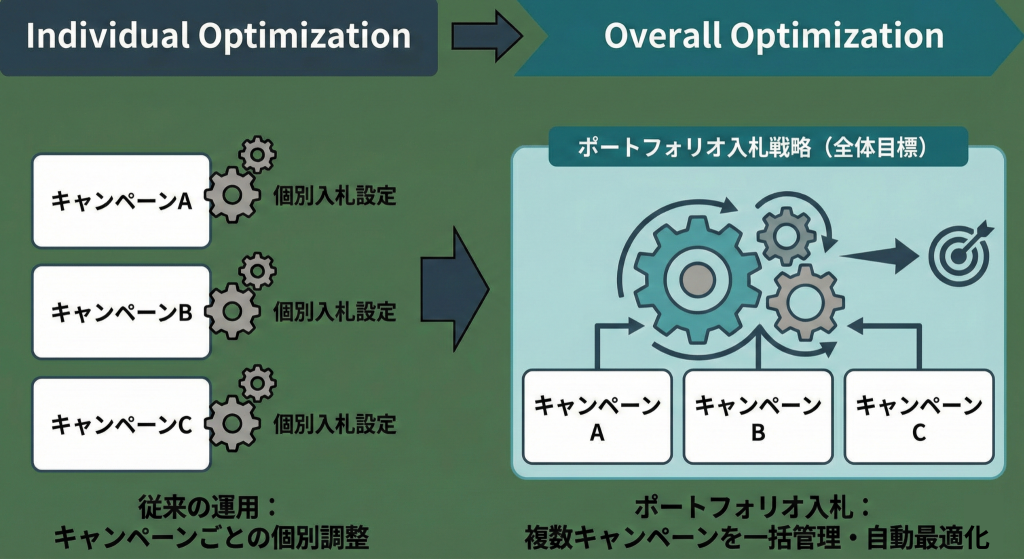 一つの入札戦略(ポートフォリオ)を、複数キャンペーンに設定することで、個別最適ではなく全体最適を目指した入札調整が行われます。