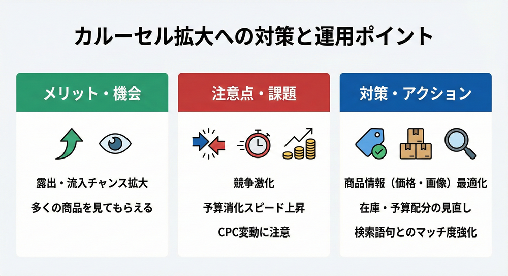 一方で、同時に表示される商品が増える分、価格・画像・商品名などの比較競争は激化する可能性があります。