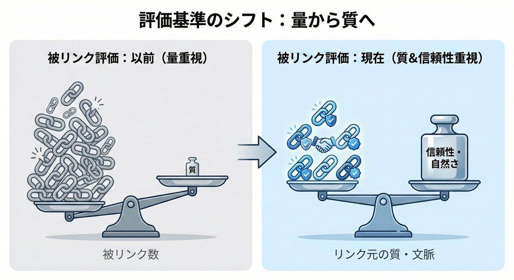 結果として、被リンクの「数」よりも「どこから・どのように」リンクされているかが、より重視されるようになったと考えられます。