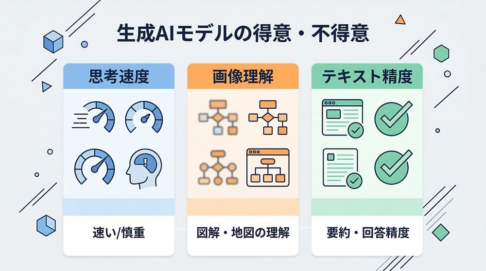 このように、「高精度だが時間をかけるモデル」「画像理解に強いモデル」「高速処理に優れたモデル」といった違いが明確になっています。