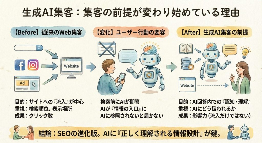 この視点を持つことが、生成AI集客を理解する第一歩になります。