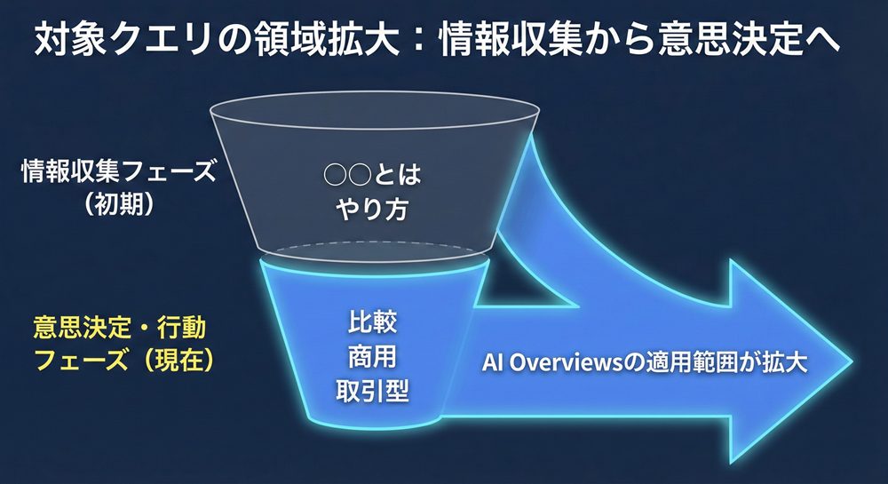 これは、AI Overviewsが検索の初期段階だけでなく、ユーザーの意思決定プロセス全体に関与し始めていることを意味します。