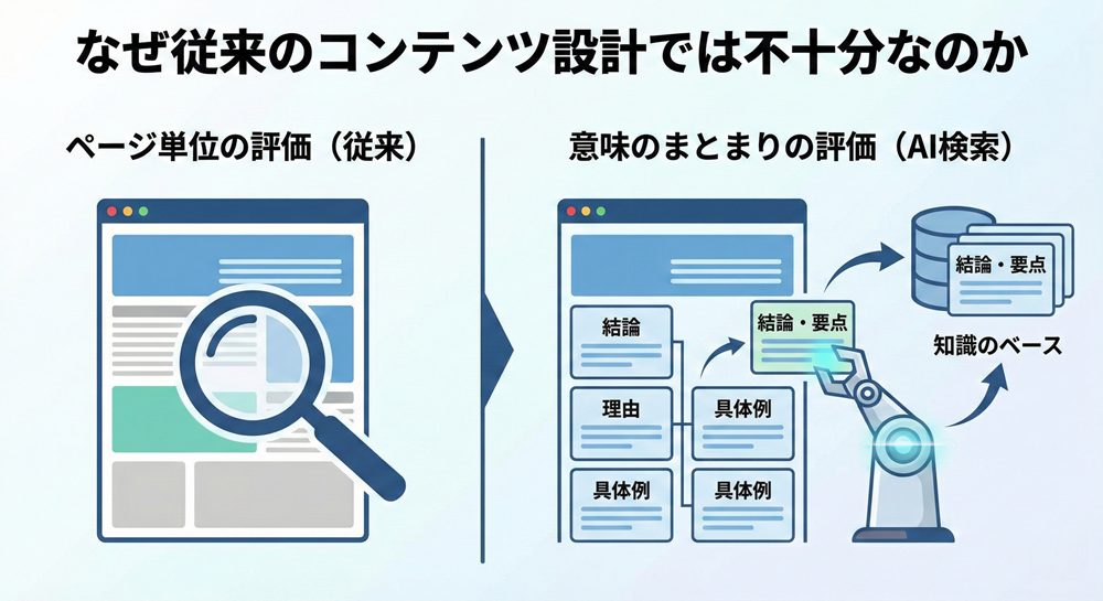 AI検索コンテンツ設計とは、生成AIが回答を構築する過程で、自社情報が適切に選ばれ、文脈付きで再利用される状態を目指す取り組みです。従来の上位表示中心の発想から、情報単位での評価へと視点を切り替える必要があります。