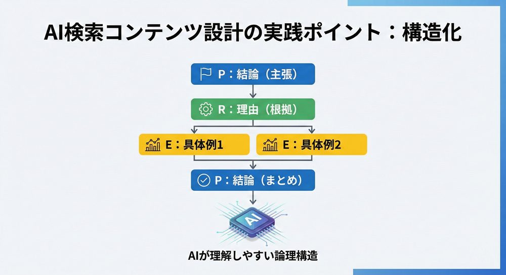 PREP法のように、主張を最初に示し、その理由や具体例を展開する構造は、AIにも人にも理解しやすい形式です。