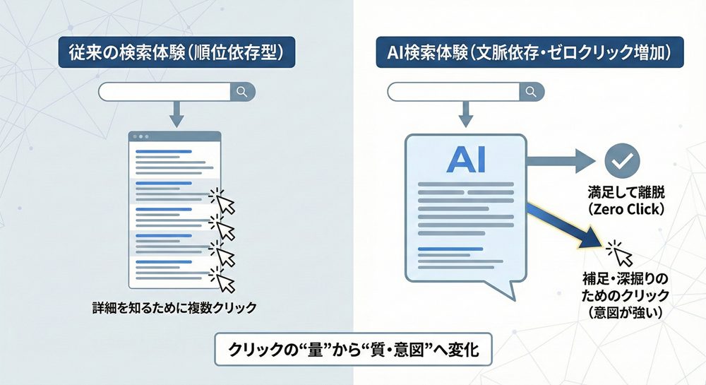 従来は「詳細を知るためにクリックする」構造でしたが、AI検索では「補足や深掘りが必要な場合のみクリックする」構造へと変わっています。そのため、クリックはより意図の強い行動になります。