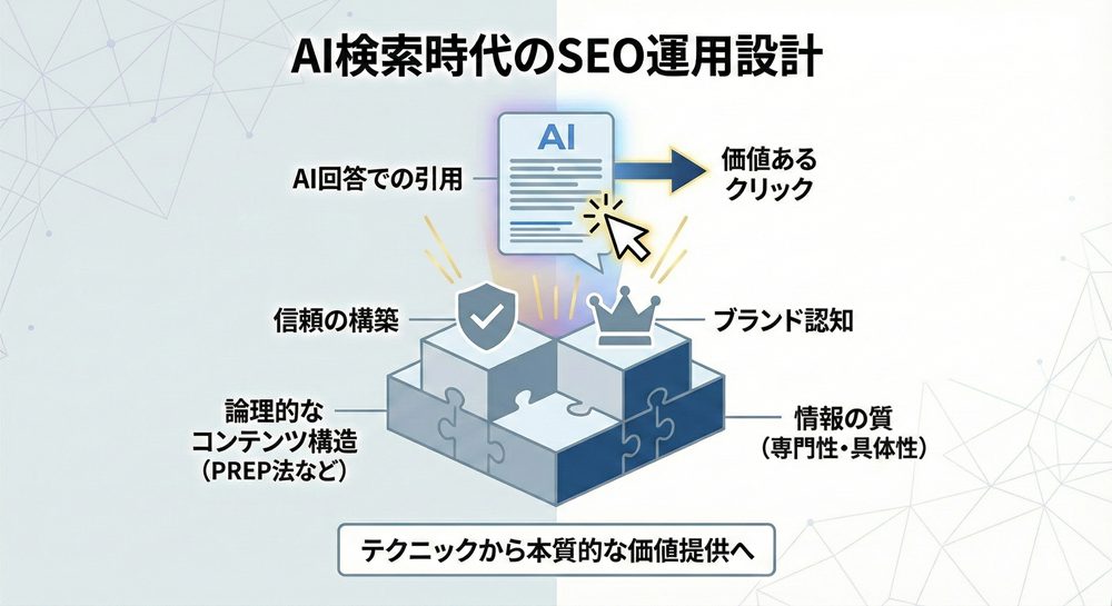 AI検索時代では、クリックを無理に増やす設計よりも、信頼を構築する設計が重要になります。AI回答内で適切に紹介されることが、ブランド形成につながります。