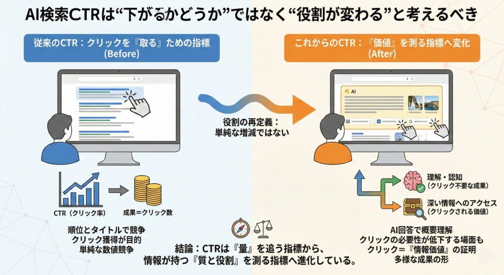 AI検索CTRは下がるか上がるかという単純な議論ではなく、役割が再定義されている指標です。