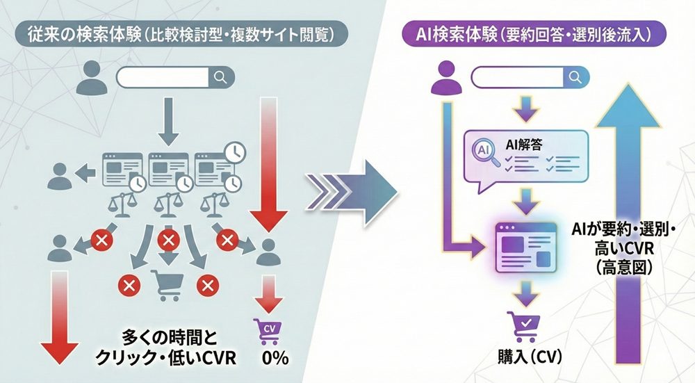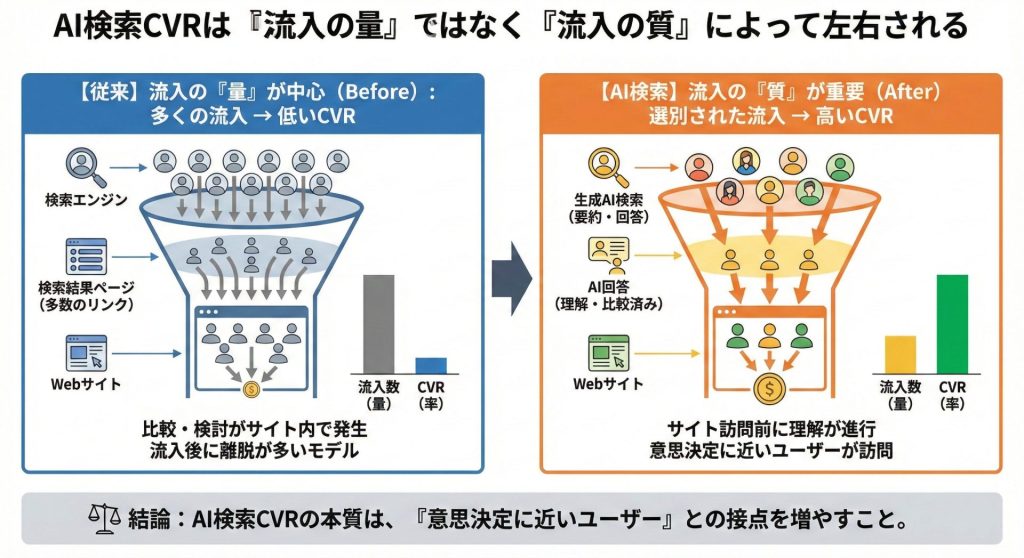 従来は「多くの流入を集め、その一部がコンバージョンする」というモデルでしたが、AI検索では「より選別された流入がコンバージョンにつながりやすい構造へ変化する傾向が見られます」。
