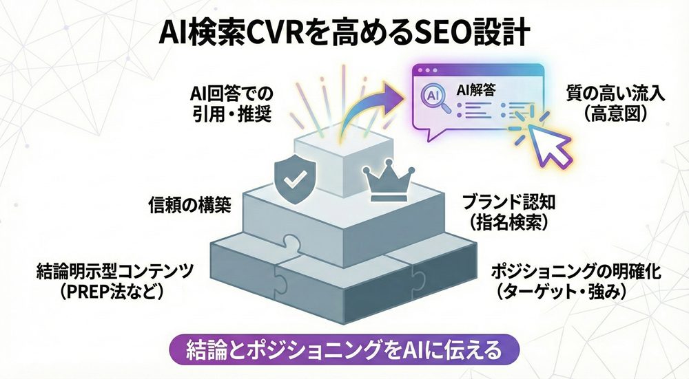 AI検索では、「誰に向いているか」「どの課題に強いか」という文脈が重視されます。曖昧なメッセージは、幅広い流入を集める可能性はありますが、CVRは安定しません。