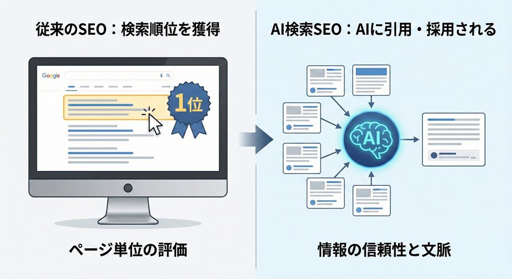 従来のSEOが検索結果ページでの順位獲得を目的としていたのに対し、AI検索SEOは「AIの回答に含まれるかどうか」を成果の起点とします。