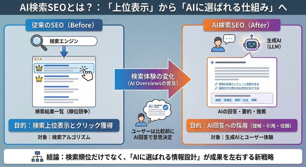 AI検索SEOは、従来SEOの延長ではなく、検索体験そのものが変わったことを前提に再設計されたSEOの全体像です。