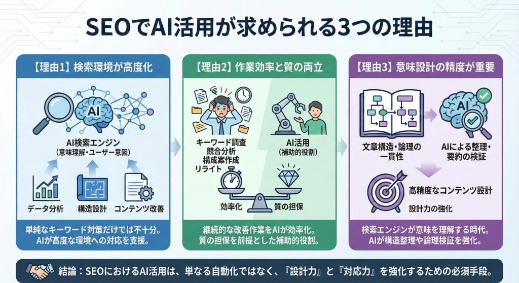 SEOにおけるAI活用の本質は、単なる作業効率化ではありません。