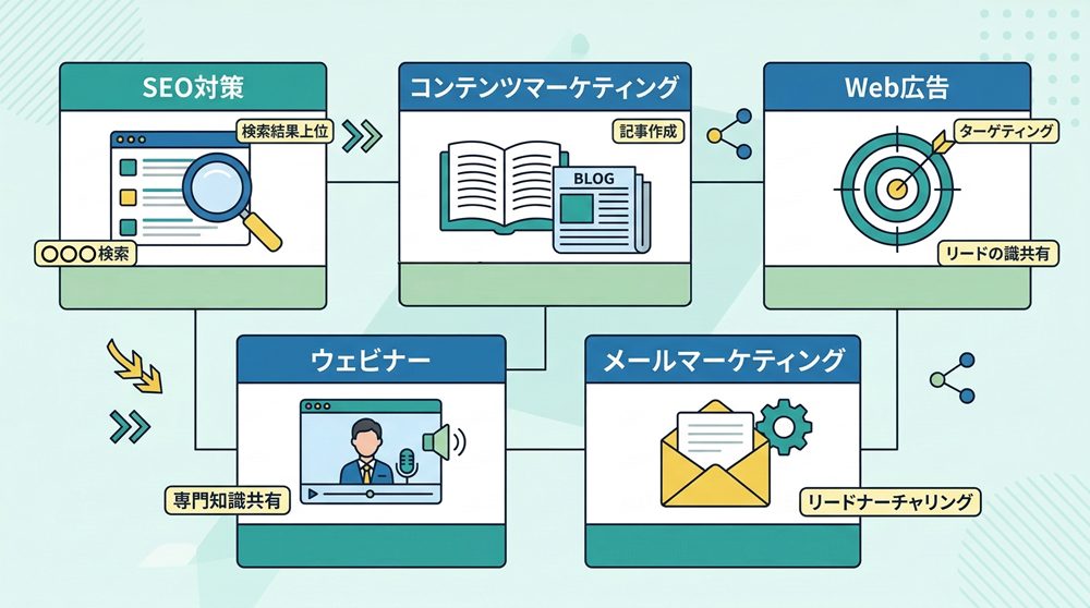 そのため、多くの企業ではSEOやコンテンツマーケティング、Web広告、セミナーなどを組み合わせながら顧客との接点を増やし、関係性を築くマーケティング施策を行っています。