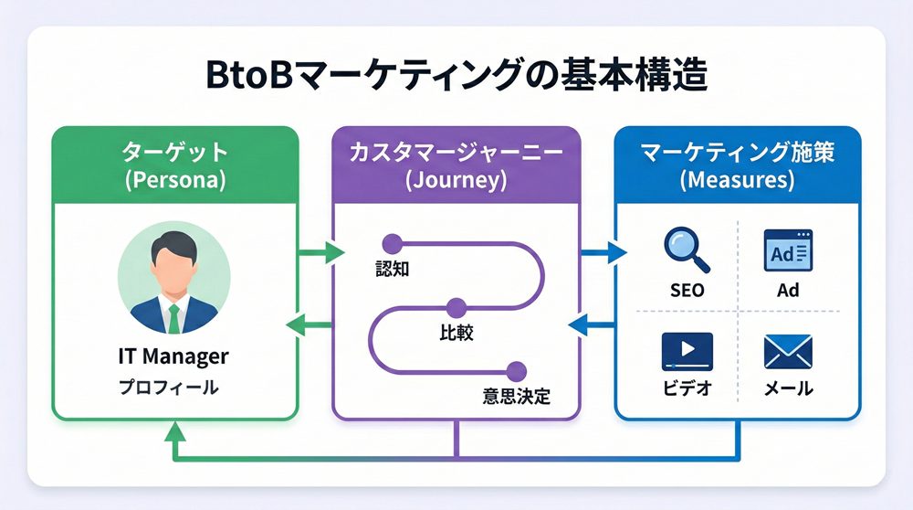 BtoBビジネスでは購買プロセスが長く、複数の関係者が意思決定に関与するため、顧客行動の全体像を踏まえた設計が重要になります。