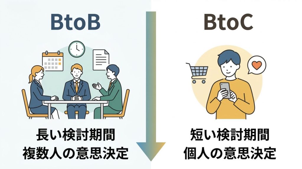 一方でBtoBでは、企業が意思決定を行うため、検討期間が長くなります。また、複数の担当者が関わるケースも多いため、信頼性の高い情報が求められます。