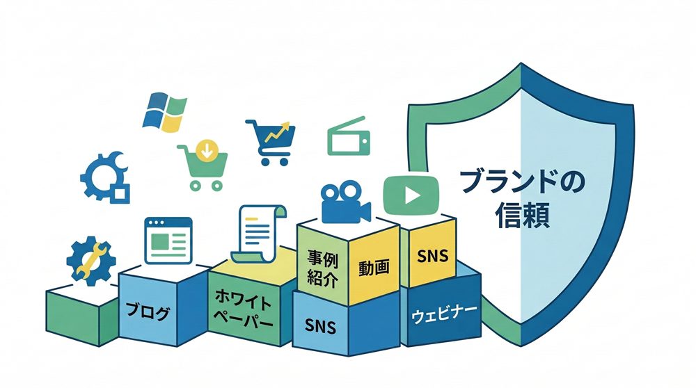 SEO記事は認知獲得、導入事例や比較記事は検討促進、ホワイトペーパーはリード獲得、調査レポートは信頼性向上というように、目的に応じて使い分けることが重要です。