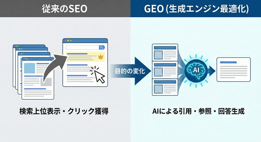 従来のSEOが「検索結果で上位表示されること」を目的としていたのに対し、GEOは「AIに理解され、回答の一部として使われること」を目的としています。