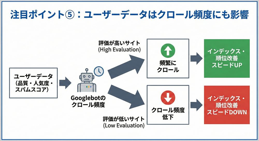 品質・人気度・スパムスコアといったユーザーデータは、Googlebotがそのサイトをどれくらいの頻度でクロールするかにも影響を与えています。