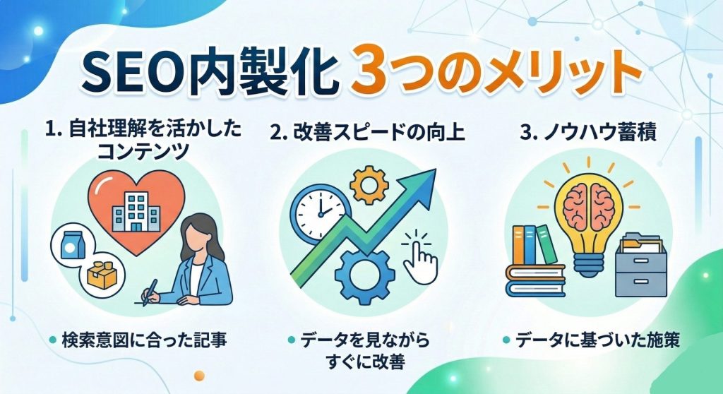 SEO内製には、コスト面だけでなくマーケティング戦略の面でも多くのメリットがあります。特にオウンドメディアやコンテンツマーケティングを重視する企業では、内製体制が成果を伸ばす土台になります。