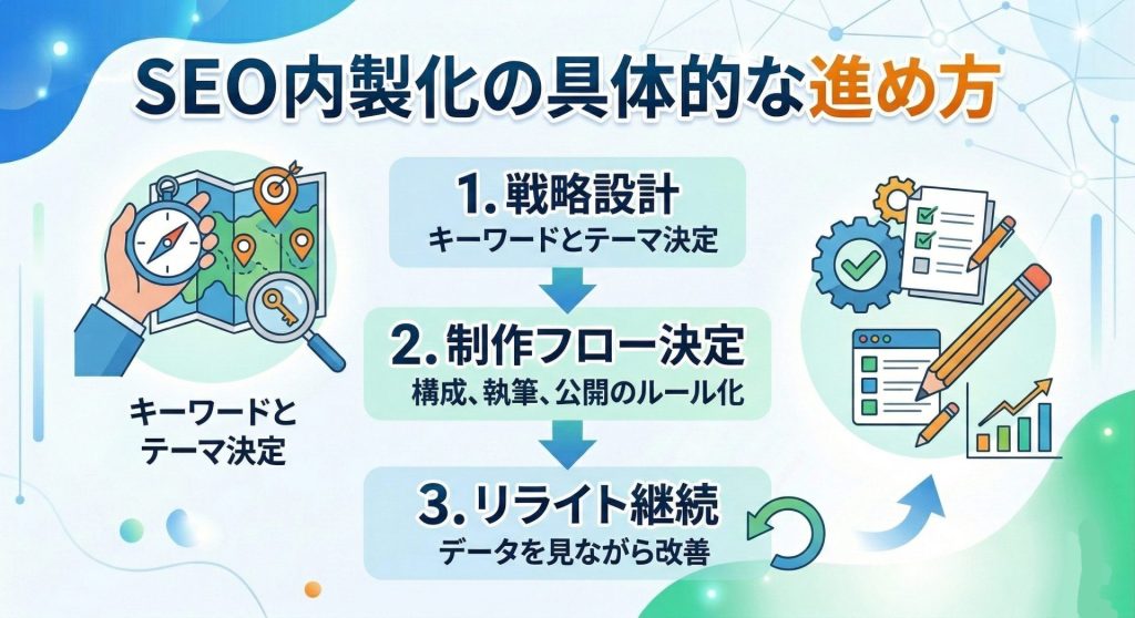 SEO内製を成功させるためには、場当たり的に記事を書くのではなく、一定の手順に沿って運用を進めることが重要です。体制を整えたうえで、継続的に改善を回す仕組みを作ることで成果が安定します。