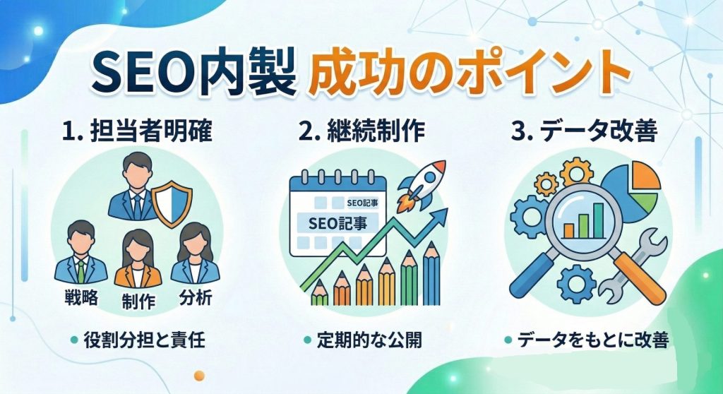 SEO内製を成功させるためには、単に記事を書く担当者を増やすだけではなく、継続的に改善できる体制を整えることが重要です。