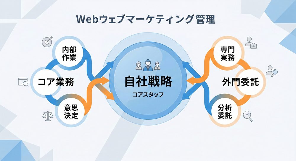 戦略設計や重要な意思決定は社内で行い、専門的な実務や分析を外部に委託する形です。