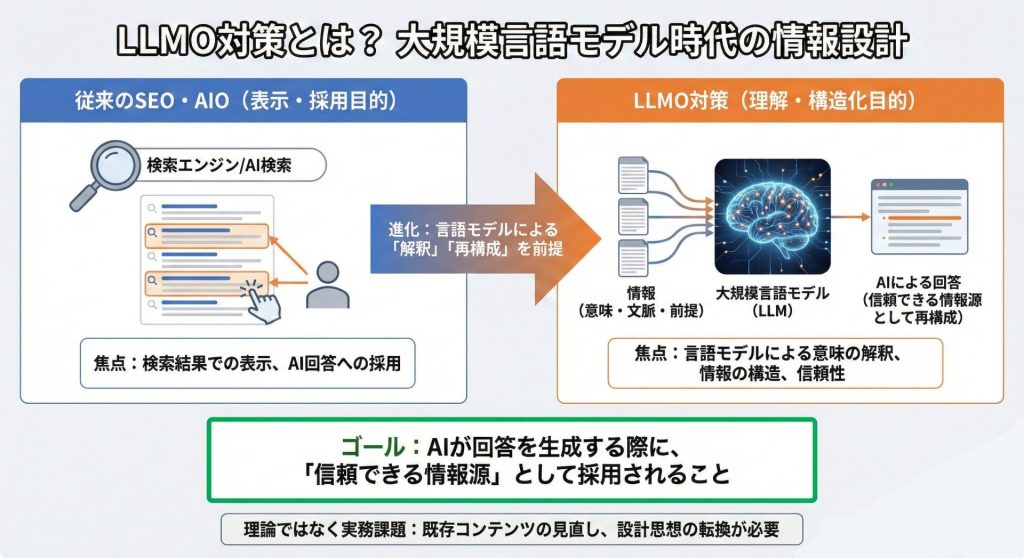 従来のSEOが主に検索エンジンでの評価向上を目的としてきたのに対し、LLMOという考え方は、言語モデルに意味が正しく伝わる構造を意識する点に特徴があります。