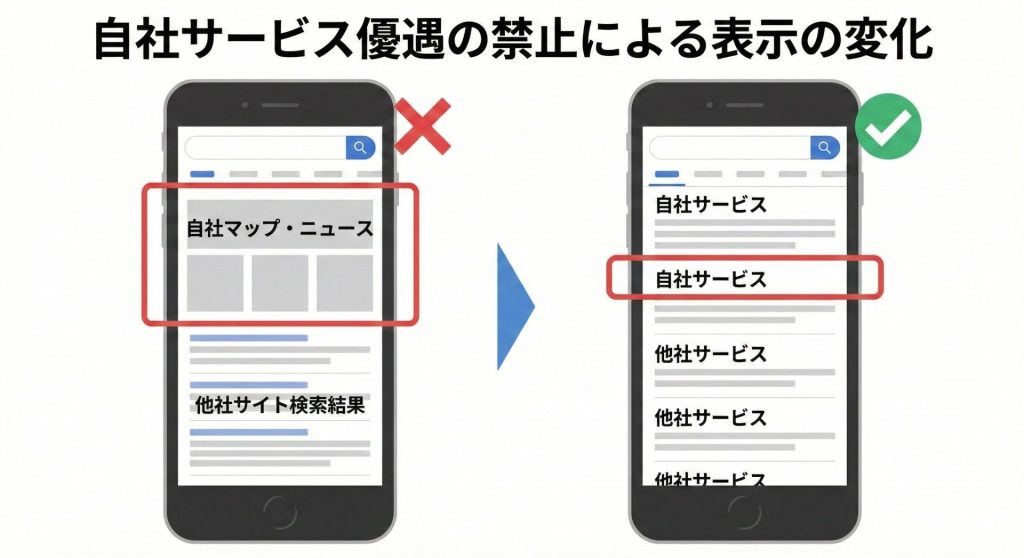 検索結果上部に自社サービスが常に表示されるような設計は、規制の観点から見直しが求められる可能性があります。