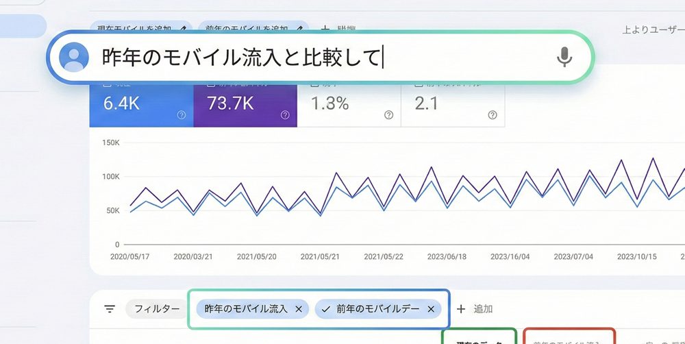 といった指示を出すだけで、AIが必要なフィルタや比較条件を設定し、分析結果を提示します。