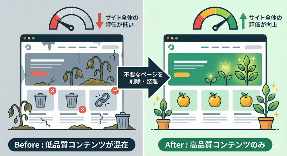 特に近年は、検索アルゴリズムがサイト全体の品質をより重視する傾向にあり、一部の低品質コンテンツが、全体評価を下げてしまうリスクが高まっています。