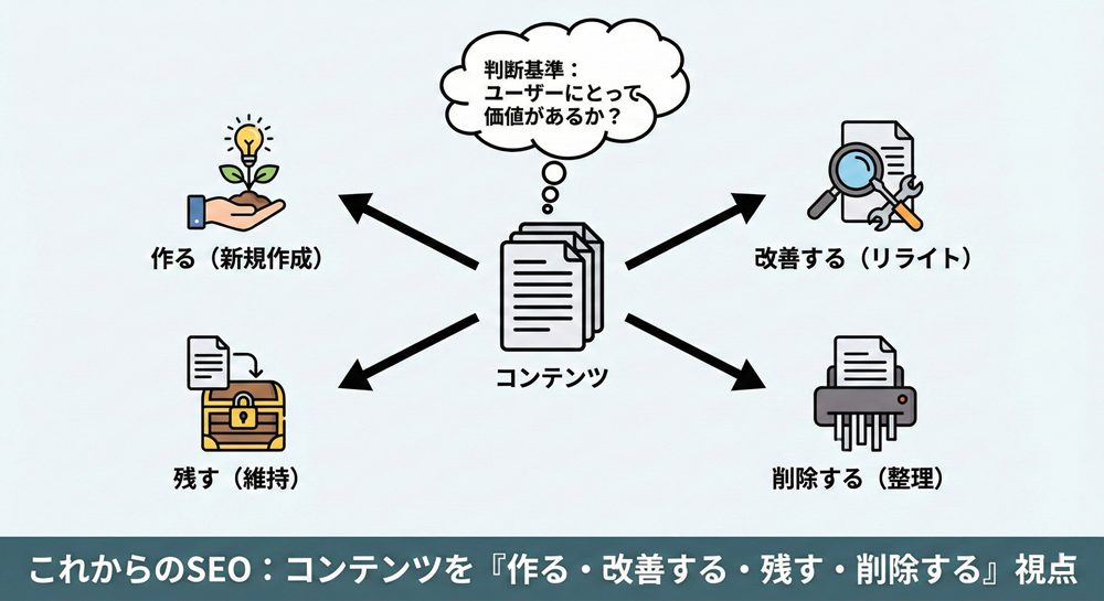 低品質なコンテンツを抱え続けるよりも、信頼される情報だけを残す勇気が、これからのSEOには求められています。