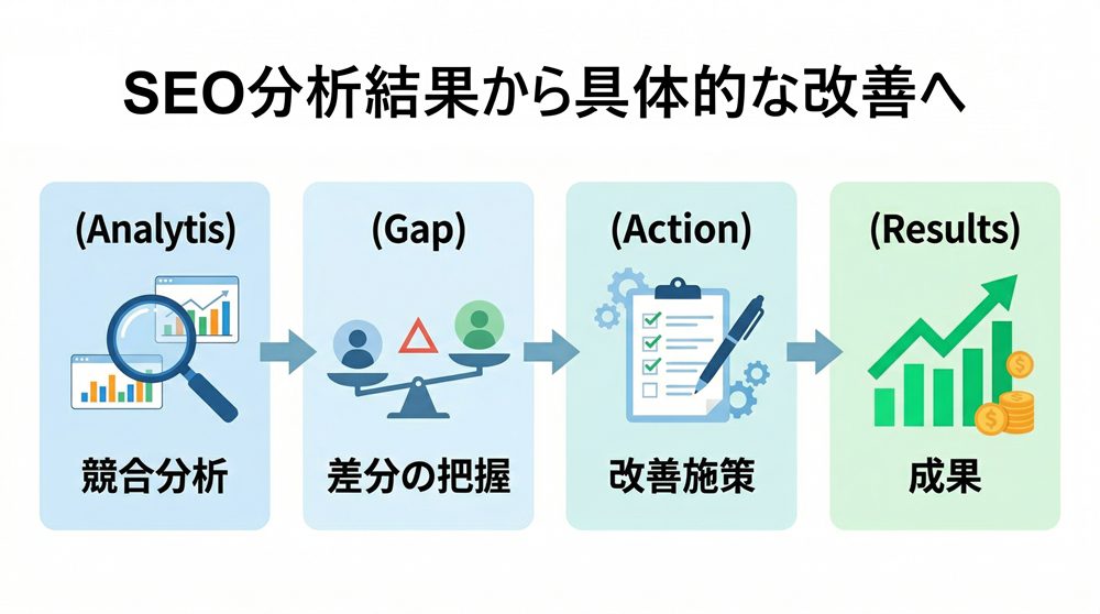 SEO競合分析で大切なのは、競合との差を把握して終わることではなく、その差をもとに改善を進めることです。