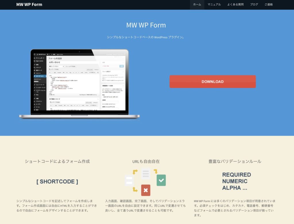 MW WP Form は、WordPressで問い合わせフォームを作成できる国産プラグインです。シンプルな操作性と日本語対応の充実度から、国内サイトを中心に幅広く利用されています。なお、現在は開発が停止されており、必要最低限のメンテナンスリリースのみの提供となっています。
