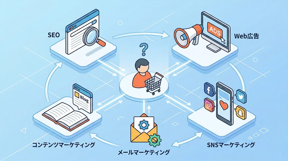 Webマーケティングでは、一つの施策だけで成果を出すことは難しい場合があります。SEOで集客し、コンテンツで理解を促し、広告で補完するように、複数の施策を組み合わせて設計することが重要になります。