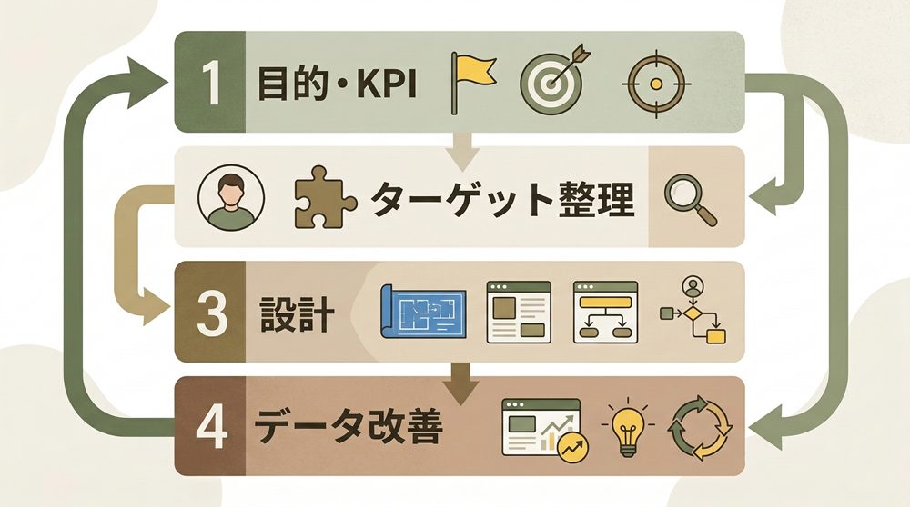 このように、Webマーケティングでは「集客」「理解」「比較」「行動」という流れを意識しながら、各施策を組み合わせて設計することが重要になります。