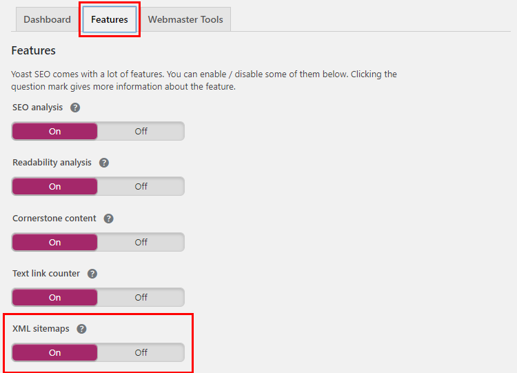 2.「機能(Feartures)」タブを選択、XML sitemapsが「On」になっていることを確認します。