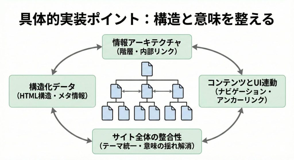 カテゴリ設計やタグ設計、内部リンクの整理を通じて、テーマごとに一貫した構造を作る必要があります。情報が体系的に整理されているサイトほど、AIにも理解されやすくなります。