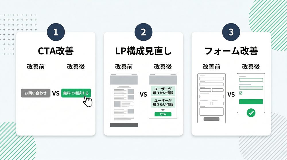 一方で、CTAの文言変更や配置の見直しといった比較的簡単に実施できる施策でも、成果に大きく影響することがあります。まずは低コストで実行できる改善から取り組むことで、効率的に成果を伸ばすことができます。
